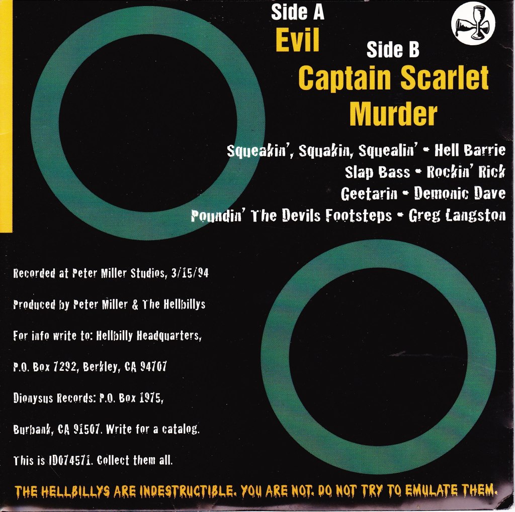 Hellbillys – Evil 7″ (1995) front cover featuring antagonist Captain Black from Captain Scarlet and The Mysterons, looking like a middle-aged Lee Ving (FEAR).